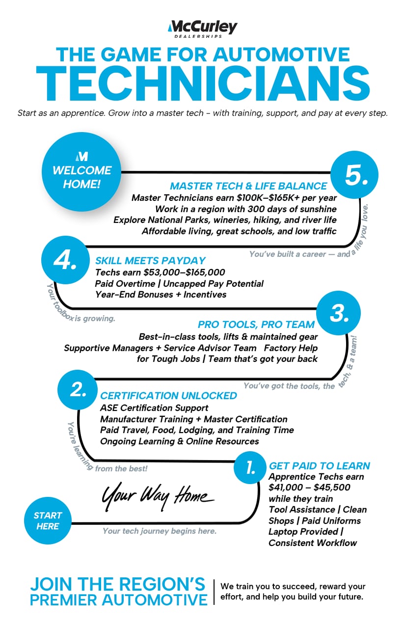 We want our employees to enjoy their jobs, and we create a fun yet hard-working atmosphere for every team at our dealership. We pay well and provide many other benefits to our service technicians. Are you looking to start as a Lube Technicians or continue your career as Master Tech. We're often hiring for different types of auto techs, whether you are entry level or have years of experience, and we're happy to train the right candidate to help them succeed! It also helps that we're right in the Tri-Cities and Yakima, which offers a low cost of living, lots of leisure activities, and terrific weather throughout the year. We're always happy to talk with interested technicians about the benefits of working for our Dealerships dealership!